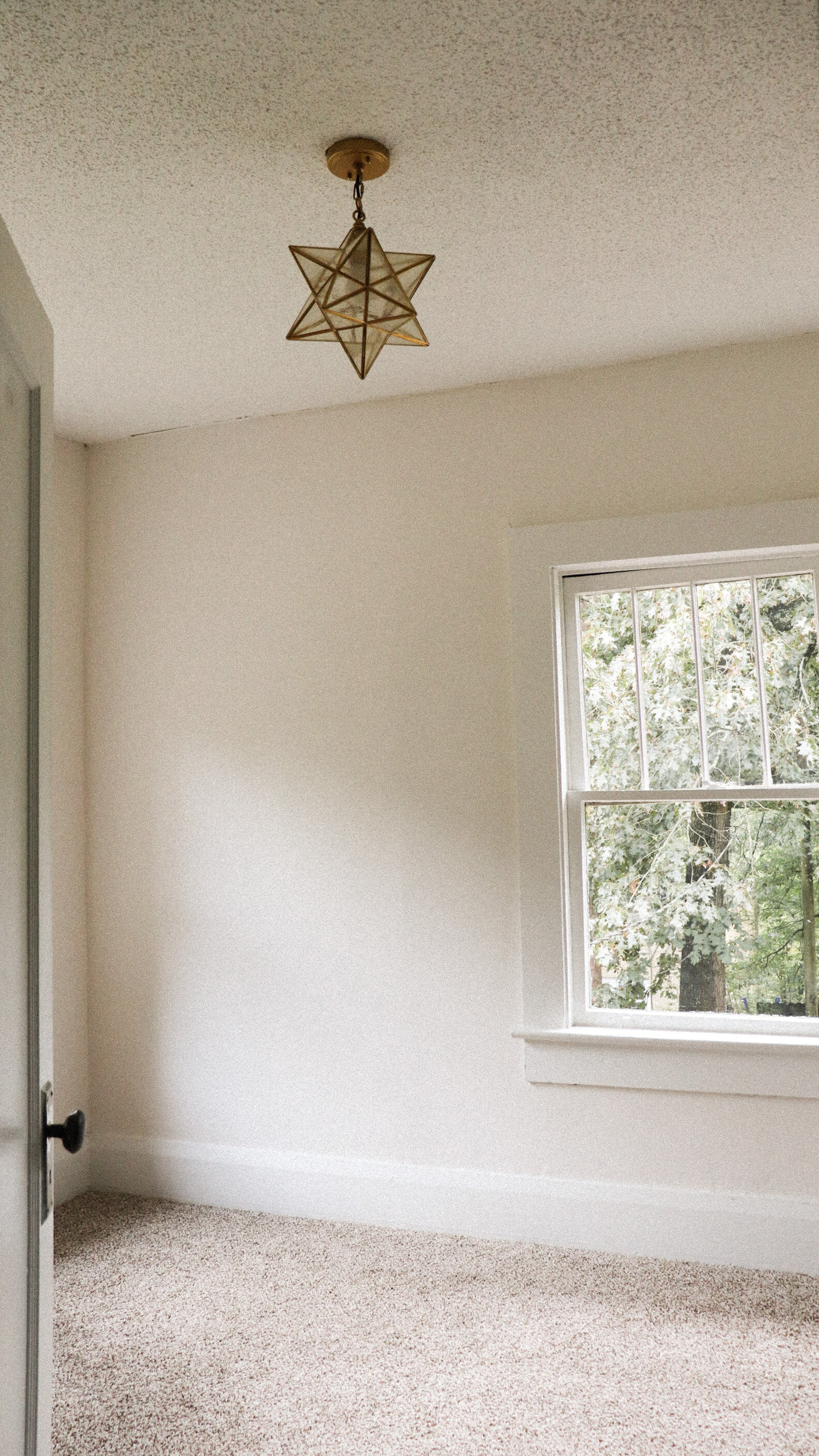 Maple House has been decorated in a Mid-Century Modern style & wanted to add some details inspired by our love of México so Trey hung this gorgeous brass star pendant light with a smart bulb that we can control from our phones.