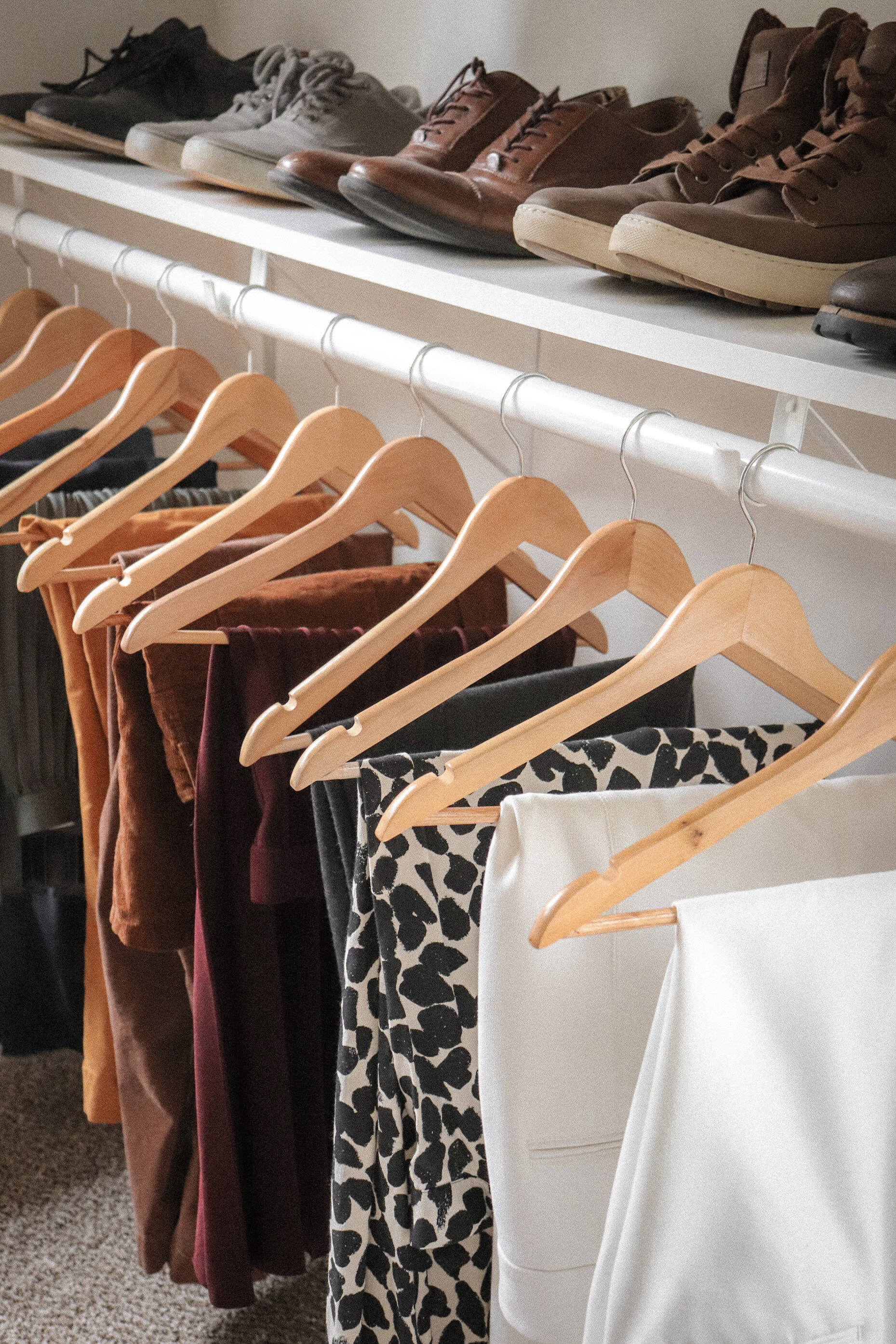 It’s so soothing walking into this space. We divided up the closet into “his & hers'' so everything would be kept separate. To give it an elevated look I hung our clothes on wooden hangers & color coordinated our wardrobe. We were able to maximize the space by using the shelves as our shoe holders & added a full length mirror to the back of the door.